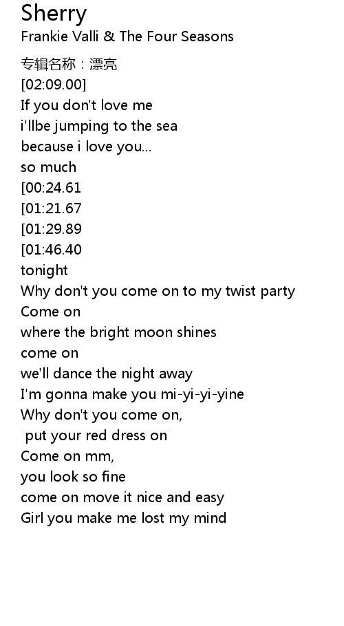 | [01:50.11][01:21.67][00:49.41][00:33.10] | Sherry baby, Sherry baby, |