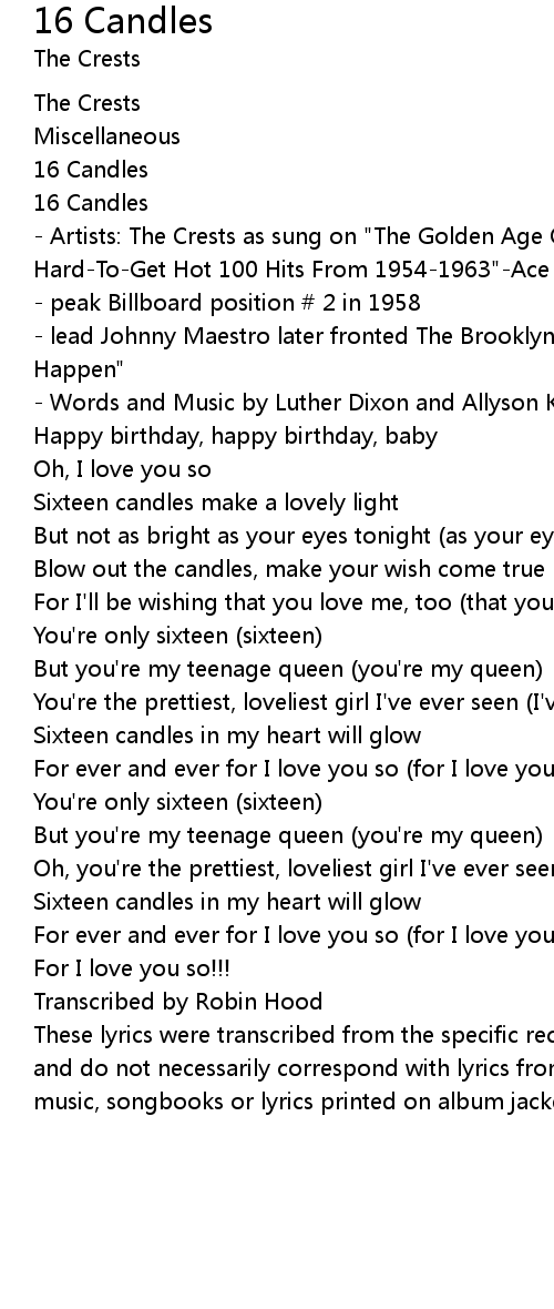 - Artists: The Crests as sung on "The Golden Age Of American Rock'n'Roll, |