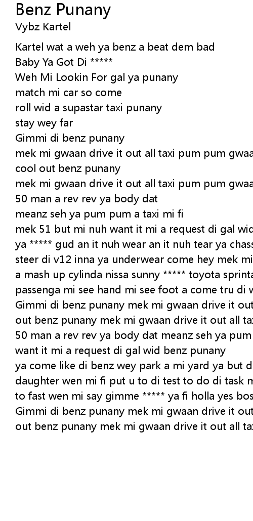 Gimmi di benz punany mek mi gwaan drive it out all taxi pum pum gwaan go cool out benz punany mek mi gwaan drive it out all taxi pum pum gwaan go cool |
