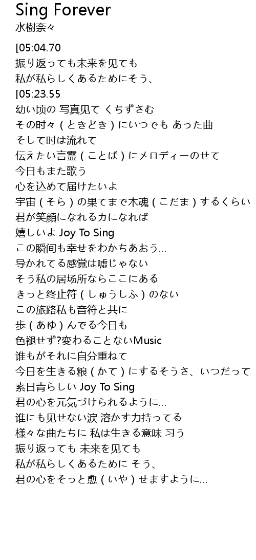 | [00:33.23][05:23.55] | これからも Joy To Sing |