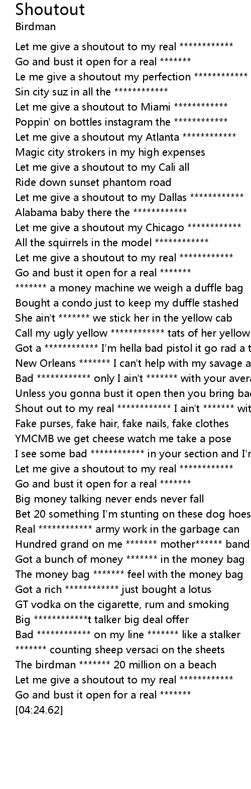 | [02:23.72] | Shout out to my real ************ I ain't ******* with fake hoes |