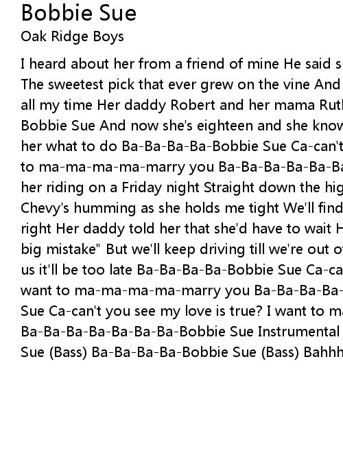 I heard about her from a friend of mine He said she lives across the county line The sweetest pick that ever grew on the vine And now that's where I'm spending all my time Her daddy Robert and her mama Ruth They had a daughter name of Bobbie Sue And now she's eighteen and she knows the truth Nobody's gonna tell her what to do Ba-Ba-Ba-Ba-Bobbie Sue Ca-can't you see my love is true? I want to ma-ma-ma-ma-marry you Ba-Ba-Ba-Ba-Ba-Ba-Ba-Bobbie Sue Instrumental I'll take her riding on a Friday night Straight down the highway in the clear moonlight My Chevy's humming as she holds me tight We'll find a preacher and we'll do it right Her daddy told her that she'd have to wait Her mama said, "Don't make a big mistake" But we'll keep driving till we're out of state And when they find us it'll be too late Ba-Ba-Ba-Ba-Bobbie Sue Ca-can't you see my love is true? I want to ma-ma-ma-ma-marry you Ba-Ba-Ba-Ba-Ba-Ba-Ba-Bobbie Sue Ba-Ba-Ba-Ba-Bobbie Sue Ca-can't you see my love is true? I want to ma-ma-ma-ma-marry you Ba-Ba-Ba-Ba-Ba-Ba-Ba-Bobbie Sue Instrumental (Bass) Ba-Ba-Ba-Ba-Ba-Ba-Ba-Bobbie Sue (Bass) Ba-Ba-Ba-Ba-Bobbie Sue (Bass) Bahhhhhhhhhhbie Sue |