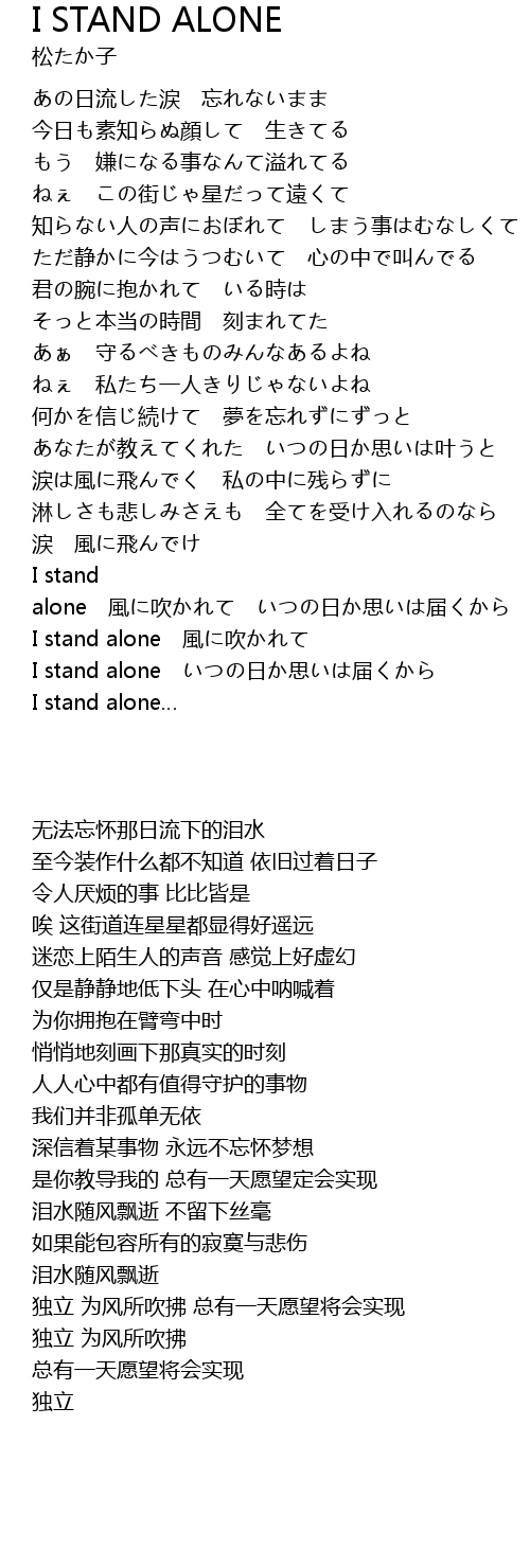| [03:34.74] | I stand alone いつの日か思いは届くから |