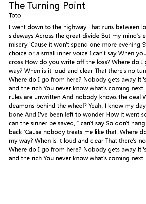 I went down to the highway That runs between love and pride And I tried to get sideways Across the great divide But my mind's eye's on the key ring Crying in misery 'Cause it won't spend one more evening Staring back at me. It may be by choice or a small inner voice I can't say When you add up the cost we all have a cross How do you write off the loss? Where do I go from here? How do I find my way? When is it loud and clear That there's no turning back? No looking back Where do I go from here? Nobody gets away It''s a new kind of fix For the poor and the rich You never know what's coming next... at the turning point. The rules are unwritten And nobody knows the deal Where have I been driven Are deamons behind the wheel? Yeah, I know my days are numbered We're only flesh and bone And I've been left to wonder How it went so wrong. Is it all tailor made, can the sinner be saved, I can't say So don't hang your hat on the knife im my back 'Cause nobody treats me like that. Where do I go from here? How do I find my way? When is it loud and clear That there's no turning back? No looking back Where do I go from here? Nobody gets away It''s a new kind of fix For the poor and the rich You never know what's coming next... at the turning point. |