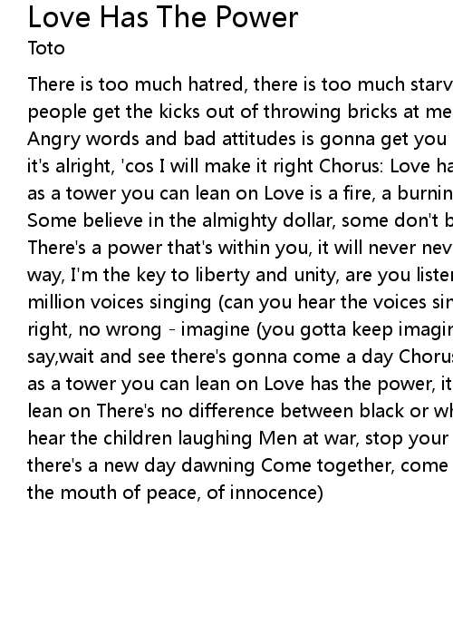 There is too much hatred, there is too much starvation, too much inhumanity Some people get the kicks out of throwing bricks at me No real reason, just jealousy Angry words and bad attitudes is gonna get you nowhere Watching you watching me, it's alright, 'cos I will make it right Chorus: Love has the power, it's strong as a tower you can lean on Love is a fire, a burning desire, it's so warm (oh) Some believe in the almighty dollar, some don't believe in nothing at all There's a power that's within you, it will never never ever let you down I'm the way, I'm the key to liberty and unity, are you listening Chorus One hundred million voices singing (can you hear the voices singing) No weak, no strong, no right, no wrong - imagine (you gotta keep imagining) Impossible, the sceptics say,wait and see there's gonna come a day Chorus Love has the power, it's strong as a tower you can lean on Love has the power, it's strong as a tower you can lean on There's no difference between black or white, the light of life I can hear the children laughing Men at war, stop your worries, give peace a chance, there's a new day dawning Come together, come together, come together (Wisdom is the mouth of peace, of innocence) |
