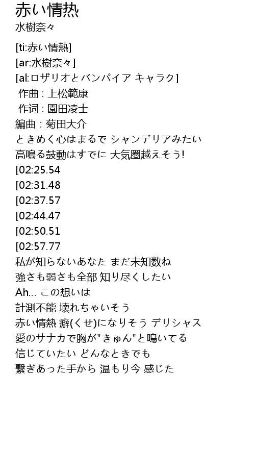 | [00:40.14][02:37.57] | 赤い情熱 感じちゃって 眩暈(めまい) |