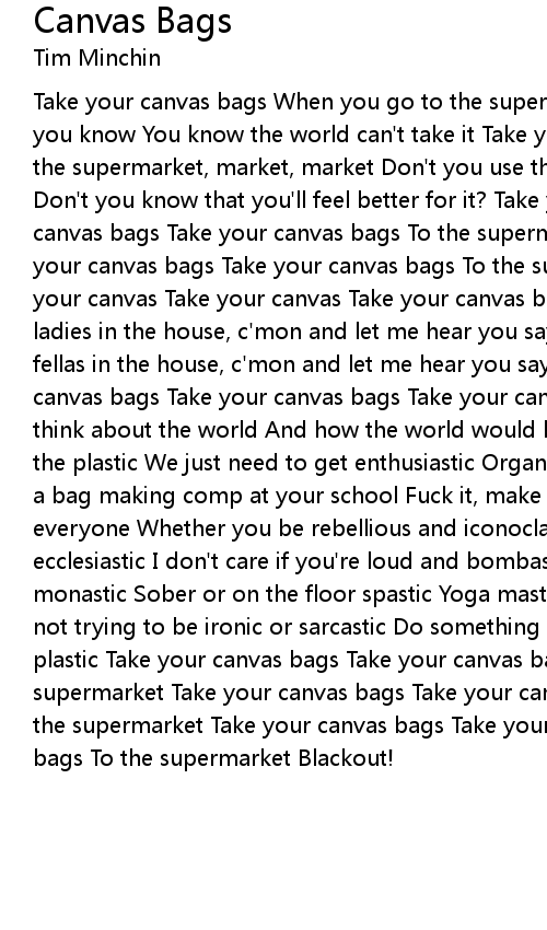 Take your canvas bags When you go to the supermarket Why use plastic bags when you know You know the world can't take it Take your canvas bags When you go to the supermarket, market, market Don't you use those plastic ones, no, no, no Don't you know that you'll feel better for it? Take your canvas bags Take your canvas bags Take your canvas bags To the supermarket Take your canvas bags Take your canvas bags Take your canvas bags To the supermarket Break it down! Take your canvas Take your canvas Take your canvas bags To the supermarket All the ladies in the house, c'mon and let me hear you say, "Canvas!" (Canvas! ) All the fellas in the house, c'mon and let me hear you say, "Bags!" (Bags! ) Take your canvas bags Take your canvas bags Take your canvas bags To the supermarket Just think about the world And how the world would be fantastic If we got rid of all the plastic We just need to get enthusiastic Organise a competition gymnastic Or a bag making comp at your school Fuck it, make it interscholastic Canvas is for everyone Whether you be rebellious and iconoclastic Or conservative or ecclesiastic I don't care if you're loud and bombastic Or quiet, or virtually monastic Sober or on the floor spastic Yoga master or completely inelastic I'm not trying to be ironic or sarcastic Do something drastic To rid the world of plastic Take your canvas bags Take your canvas bags Take your canvas bags To the supermarket Take your canvas bags Take your canvas bags Take your canvas bags To the supermarket Take your canvas bags Take your canvas bags Take your canvas bags To the supermarket Blackout! |