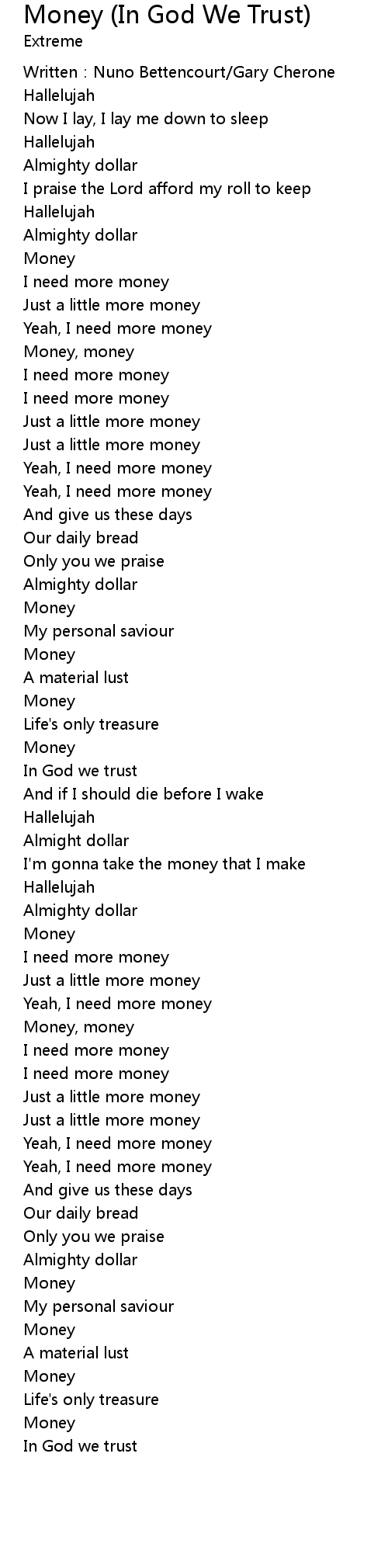 | Song | Money (In God We Trust) |