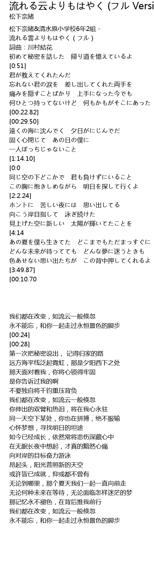 | [1:18.88][0:0][3:51] | 流れる雲よりもはやく 僕ら変わってゆくけど |