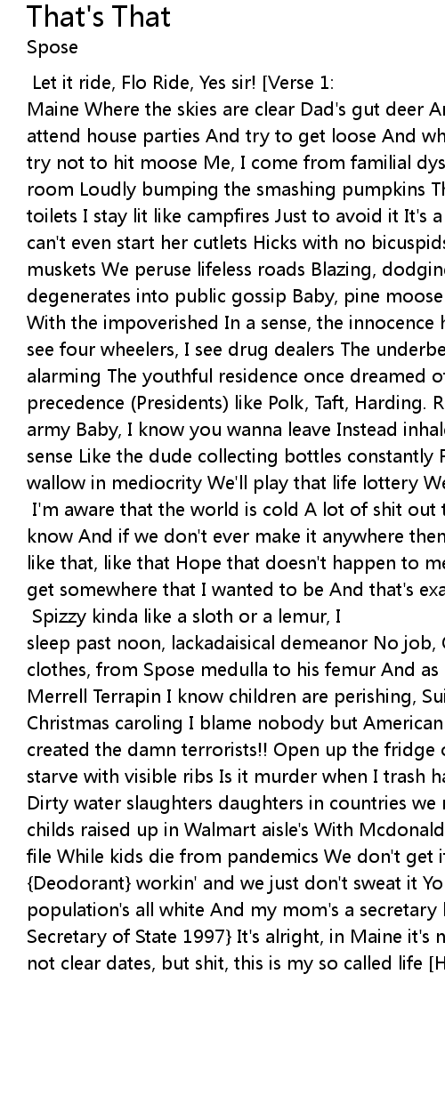 [Intro:] Let it ride, Flo Ride, Yes sir! [Verse 1:] My brethren habitate Wells Maine Where the skies are clear Dad's gut deer And sip upon shipyard beer We attend house parties And try to get loose And when we're drunk driving home We try not to hit moose Me, I come from familial dysfunction I'll be hiding in my room Loudly bumping the smashing pumpkins The world is a vampire Dirtier than toilets I stay lit like campfires Just to avoid it It's a cold world My mom can't even start her cutlets Hicks with no bicuspids In the bushes busting muskets We peruse lifeless roads Blazing, dodging possum As private business degenerates into public gossip Baby, pine moose lobster Wealthy folks cohabitate With the impoverished In a sense, the innocence has been demolished I mean, you see four wheelers, I see drug dealers The underbelly's less obvious The contrast alarming The youthful residence once dreamed of departing Just, to set precedence (Presidents) like Polk, Taft, Harding. Resort to jail coke, we're the army Baby, I know you wanna leave Instead inhale marijuana leaves Which makes sense Like the dude collecting bottles constantly Follow me, wanna-be's, as we wallow in mediocrity We'll play that life lottery We'll get to where ought to be [Hook:] I'm aware that the world is cold A lot of shit out there that I don't know And if we don't ever make it anywhere then I guess that's that, like that, like that, like that Hope that doesn't happen to me And if it does I'll probably get somewhere that I wanted to be And that's exactly how I'll live 'till then Yeah dude, that's that... [Verse 2:] Spizzy kinda like a sloth or a lemur, I sleep past noon, lackadaisical demeanor No job, Oldsmobile and no Bimmer, Dirty clothes, from Spose medulla to his femur And as I'm ballin' hard like the Merrell Terrapin I know children are perishing, Suicide vans in Bethlehem, no Christmas caroling I blame nobody but American arrogance I mean, (hmm, shit) we created the damn terrorists!! Open up the fridge on MTV Cribs As miserable kids starve with visible ribs Is it murder when I trash half my bacon cheeseburger? Dirty water slaughters daughters in countries we never heard of American's childs raised up in Walmart aisle's With Mcdonald's cups Line them up Single file While kids die from pandemics We don't get it Or that Speedstick's {Deodorant} workin' and we just don't sweat it You see in my town, the population's all white And my mom's a secretary like Madelin Albright {U.S. Secretary of State 1997} It's alright, in Maine it's not the cold vain And I'm not clear dates, but shit, this is my so called life [Hook:] |