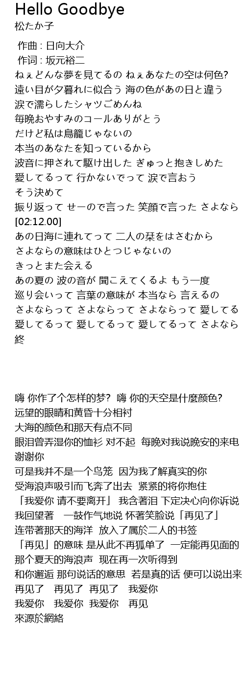 | [02:34.00] | さよならの意味はひとつじゃないの きっとまた会える |