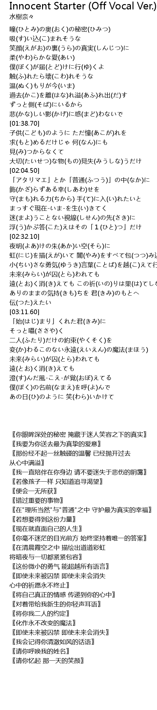 | [03:21.31] | 「始(はじ)まり」くれた君(きみ)に そっと囁(ささや)く |