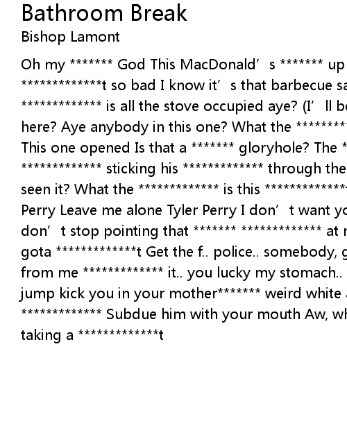 | Oh my ******* God This MacDonald’s ******* up my stomach I gotta *************t so bad I know it’s that barbecue sauce Yo yo yo yo Why the ************* is all the stove occupied aye? (I’ll be right back) Yo, anybody here? Aye anybody in this one? What the *************? Oh *************t, okay. This one opened Is that a ******* gloryhole? The ************* is this? ************* sticking his ************* through the.. The ************* yo? You seen it? What the ************* is this *************t? Yo it’s ******* Tyler Perry Leave me alone Tyler Perry I don’t want your House of Pain If you don’t stop pointing that ******* ************* at me I’mma.. You lucky I gota *************t Get the f.. police.. somebody, get this ************* away from me ************* it.. you lucky my stomach.. ************* I will I will jump kick you in your mother******* weird white ass Security! Caps, get the ************* Subdue him with your mouth Aw, what the ************* man? I’m taking a *************t |