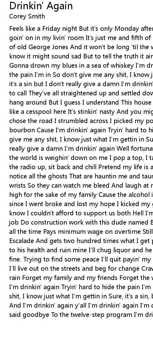Feels like a Friday night But it's only Monday afternoon Still there's a party goin' on in my livin' room It's just me and fifth of Beam Swayin' to the sounds of old George Jones And it won't be long 'til the whole damn bottle's gone And I know it might sound sad But to tell the truth it ain't half bad I love my misery Gonna drown my blues in a sea of whiskey I'm drinkin' again Tryin' hard to hide the pain I'm in So don't give me any shit, I know just what I'm gettin' in Sure, it's a sin but I don't really give a damn I'm drinkin' again I've got no friends to call They've all straightened up and settled down And they don't ever wanna hang around But I guess I understand This house ain't much for company Smells like a cesspool here It's stinkin' nasty And you might say I'm bad off But I chose the road I strumbled across I picked my poison Give me another shot of bourbon Cause I'm drinkin' again Tryin' hard to hide the pain I'm in So don't give me any shit, I know just what I'm gettin in Sure, it's a sin but I don't really give a damn I'm drinkin' again Well fortunately for me I find relief When the world is weighin' down on me I pop a top, I take a shot, I drop a pill Turn the radio up, sit back and chill Pretend my life is a bed of roses Try not to notice all the ghosts That are hauntin me and tauntin me And wantin me to cut my wrists So they can watch me bleed And laugh at me, as I scream in agony I get high for the sake of my family Cause the alcohol is all that's helpin me To cope since I went broke and lost my hope I kicked my girl to the curb of the road You know I couldn't afford to support us both Hell I'm not rich, don't have a good job Do construction work with this dude named Bob And he's an ass. Yells at me all the time Pays minimum wage on overtime Still he's got it made, drives an Escalade And gets two hundred times what I get paid But that's okay. I'll drink to his health and ruin mine I'll chug liquor and he can sip red wine And I'll be fine. Trying to find some peace I'll quit payin' my rent and I'll break my lease I'll live out on the streets and beg for change Crawl in a box when it starts to rain Forget my family and my friends Forget the world, ya'll, I'm drinkin' again I'm drinkin' again Tryin' hard to hide the pain I'm in So don't give me any shit, I know just what I'm gettin in Sure, it's a sin, but I done lost control And I'm drinkin' again y'all I'm drinkin' again I'm drinkin' again... I done said goodbye To the twelve-step program I'm drinkin' again... |