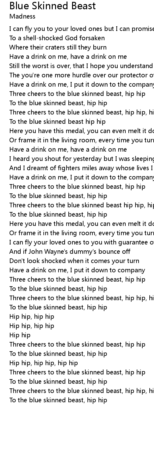 | To the blue skinned beast, hip hip |