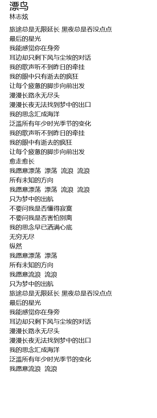 | [01:19.179] | 我愿意漂荡 漂荡 流浪 流浪 |