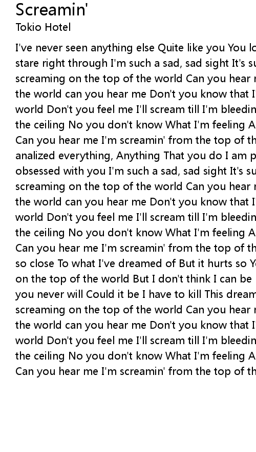 I've never seen anything else Quite like you You look at me vacantly empty Just stare right through I'm such a sad, sad sight It's such a cold, cold night I'm screaming on the top of the world Can you hear me I'm screamin' from the top of the world can you hear me Don't you know that I'm screamin' from the top of the world Don't you feel me I'll scream till I'm bleeding and I will crush through the ceiling No you don't know What I'm feeling And that I'm dying Trying, trying Can you hear me I'm screamin' from the top of the world can you hear me I've analized everything, Anything That you do I am physically, mentally over obsessed with you I'm such a sad, sad sight It's such a cold, cold night I'm screaming on the top of the world Can you hear me I'm screamin' from the top of the world can you hear me Don't you know that I'm screamin' from the top of the world Don't you feel me I'll scream till I'm bleeding and I will crush through the ceiling No you don't know What I'm feeling And that I'm dying Trying, trying Can you hear me I'm screamin' from the top of the world can you hear me And I'm so close To what I've dreamed of But it hurts so Yeah it hurts so I'm screamin' on the top of the world But I don't think I can be heard by you, you Could it be you never will Could it be I have to kill This dream that makes me ill I'm screaming on the top of the world Can you hear me I'm screamin' from the top of the world can you hear me Don't you know that I'm screamin' from the top of the world Don't you feel me I'll scream till I'm bleeding and I will crush through the ceiling No you don't know What I'm feeling And that I'm dying Trying, trying Can you hear me I'm screamin' from the top of the world can you hear me
