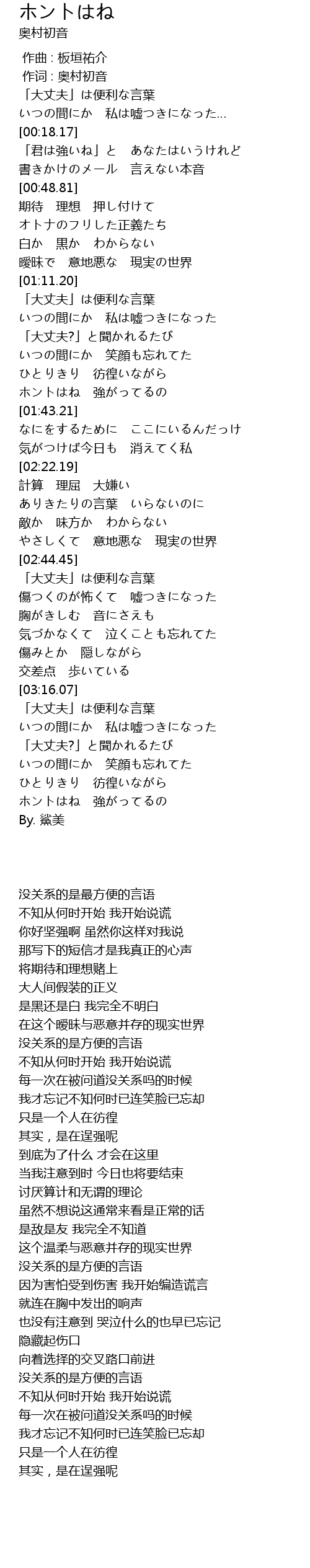 | [01:16.46] | いつの間にか 私は嘘つきになった |