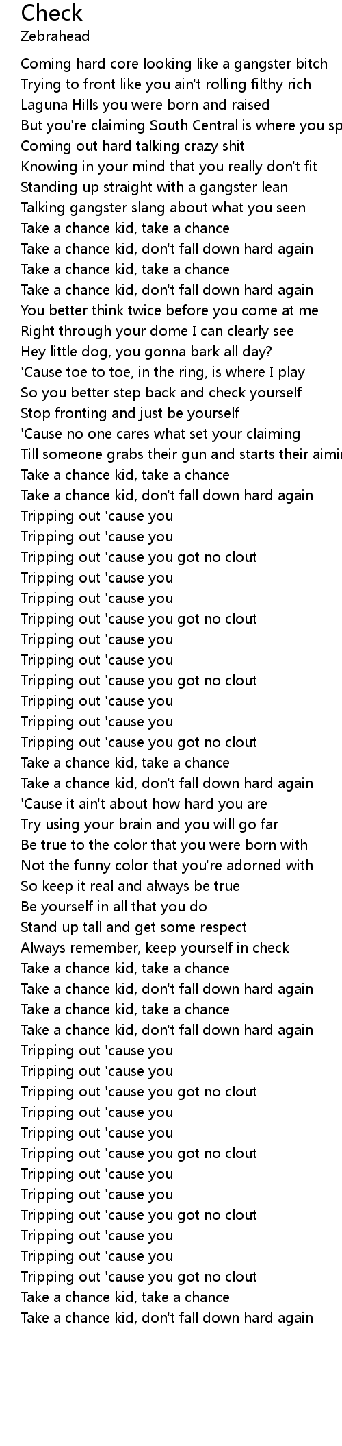 | Tripping out 'cause you got no clout | |