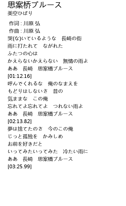 | [02:00.17] | ああ 長崎 思案橋ブルース |