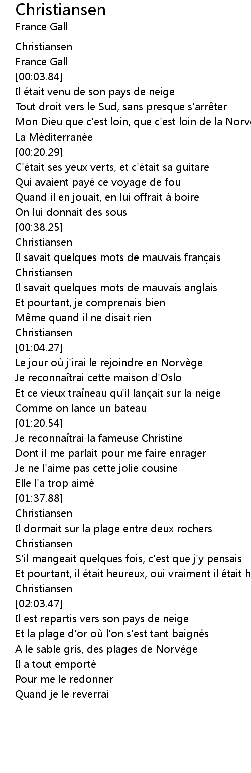 | [02:11.82] | A le sable gris, des plages de Norvège |
