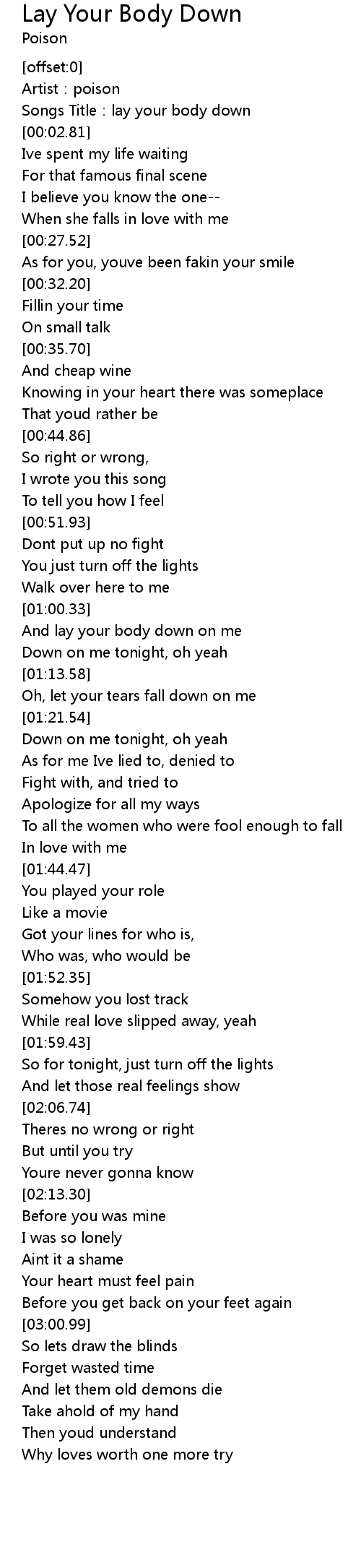 | [00:01.18] | Songs Title:lay your body down |
