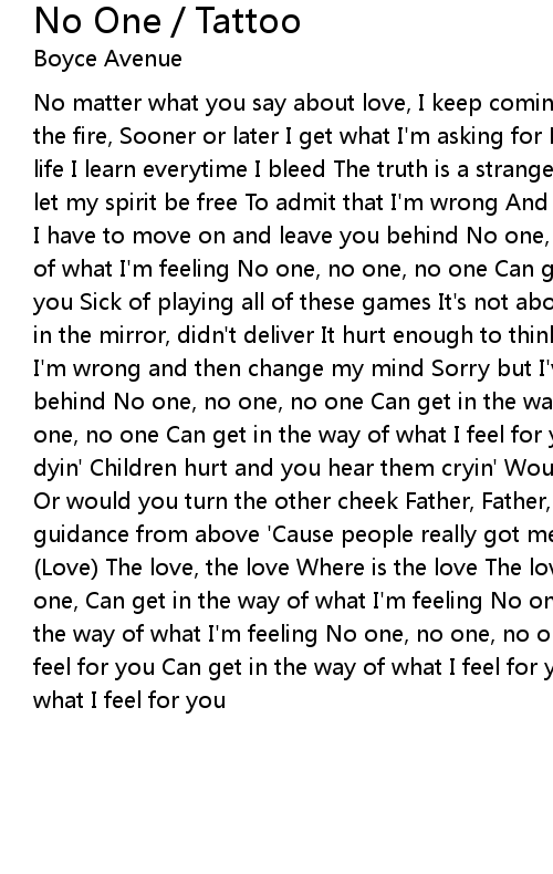 No matter what you say about love, I keep coming back for more, Keep my head in the fire, Sooner or later I get what I'm asking for No matter what you say about life I learn everytime I bleed The truth is a stranger Soul is in danger I gotta let my spirit be free To admit that I'm wrong And then change my mind Sorry but I have to move on and leave you behind No one, no one, no one Can get in the way of what I'm feeling No one, no one, no one Can get in the way of what I feel for you Sick of playing all of these games It's not about taking sides When I looked in the mirror, didn't deliver It hurt enough to think I could stop Admit that I'm wrong and then change my mind Sorry but I've gotta be strong and leave you behind No one, no one, no one Can get in the way of what I'm feeling No one, no one, no one Can get in the way of what I feel for you People killin', people dyin' Children hurt and you hear them cryin' Would you practice what you preach Or would you turn the other cheek Father, Father, Father help us Send us some guidance from above 'Cause people really got me questionin' Where is the love (Love) The love, the love Where is the love The love, the love And no one, no one, Can get in the way of what I'm feeling No one, no one, no one Can get in the way of what I'm feeling No one, no one, no one Can get in the way of what I feel for you Can get in the way of what I feel for you Can get in the way of what I feel for you |