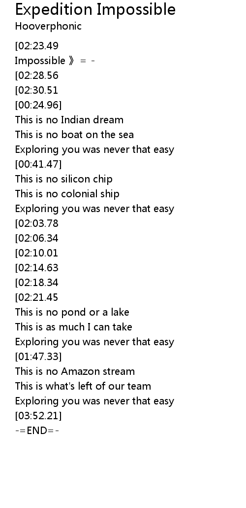 | [03:05.61][02:23.49][01:17.52][00:10.53] | Hooverphonic Expedition Impossible |