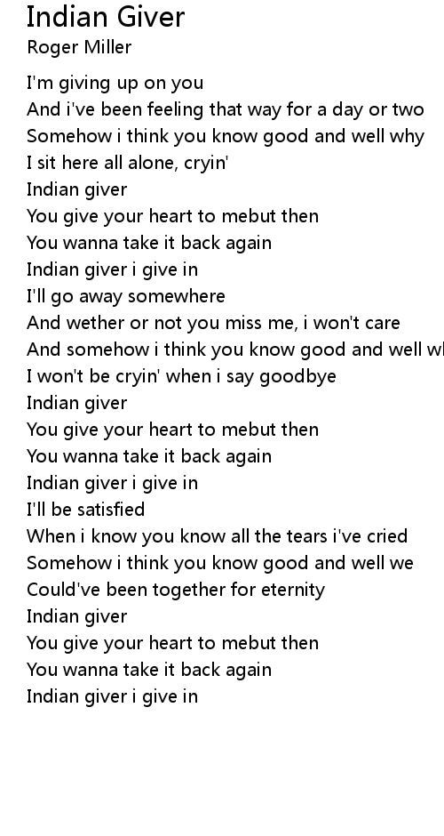 Indian giver i give in |