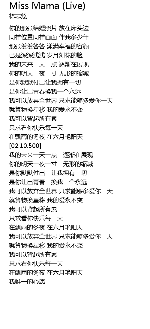 | [02:34.100] | 是你默默付出 让我拥有一切 |