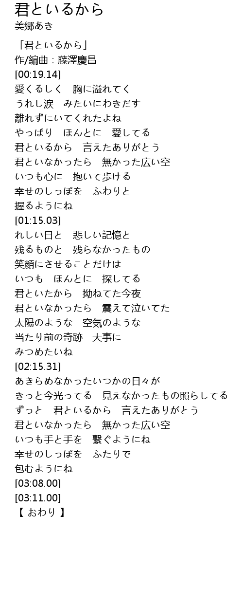 | [02:39.40] | ずっと 君といるから 言えたありがとう |