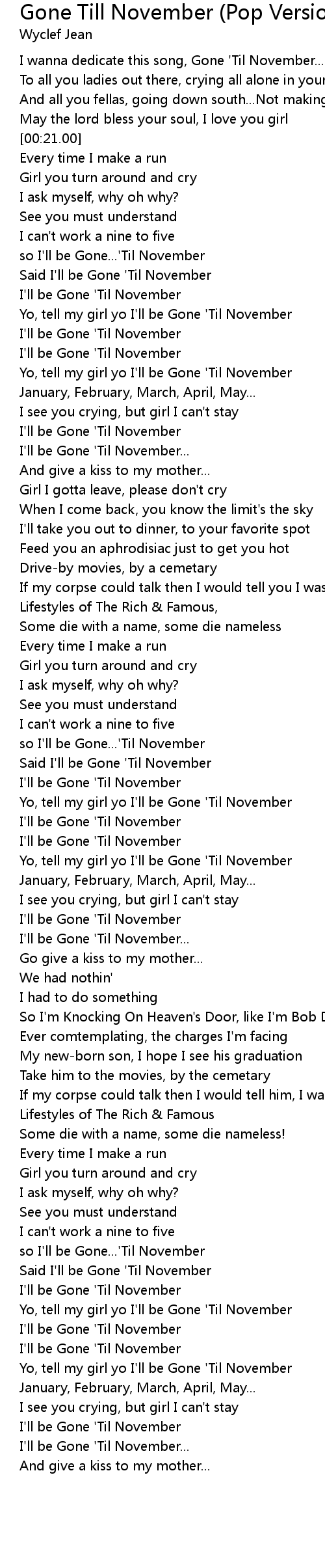 Yo, tell my girl yo I'll be Gone 'Til November |