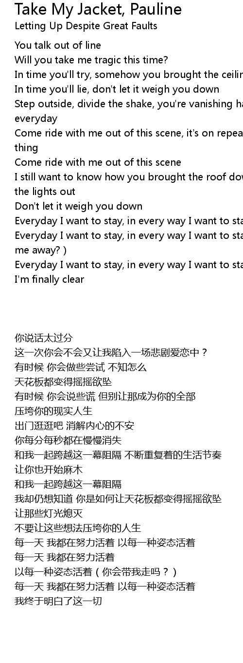 | [02:35.220] | Everyday I want to stay, in every way I want to stay Will you take me away? |