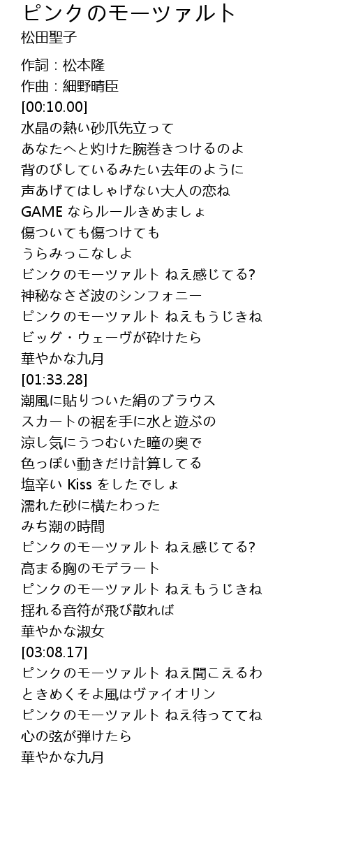 | [03:10.10] | ピンクのモーツァルト ねえ聞こえるわ |