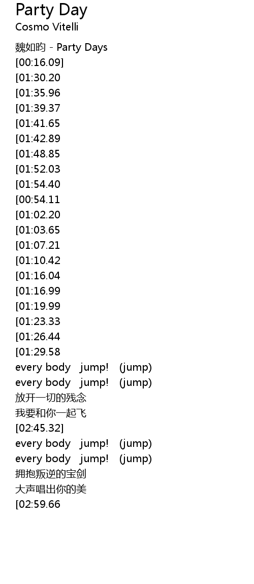 | [03:01.32][01:30.20][00:26.09] | party days I can' t wait for party days |