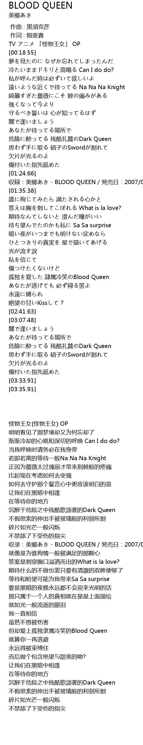 | [01:26.66] | 収録:美郷あき - BLOOD QUEEN/発売日:2007/05/09 |