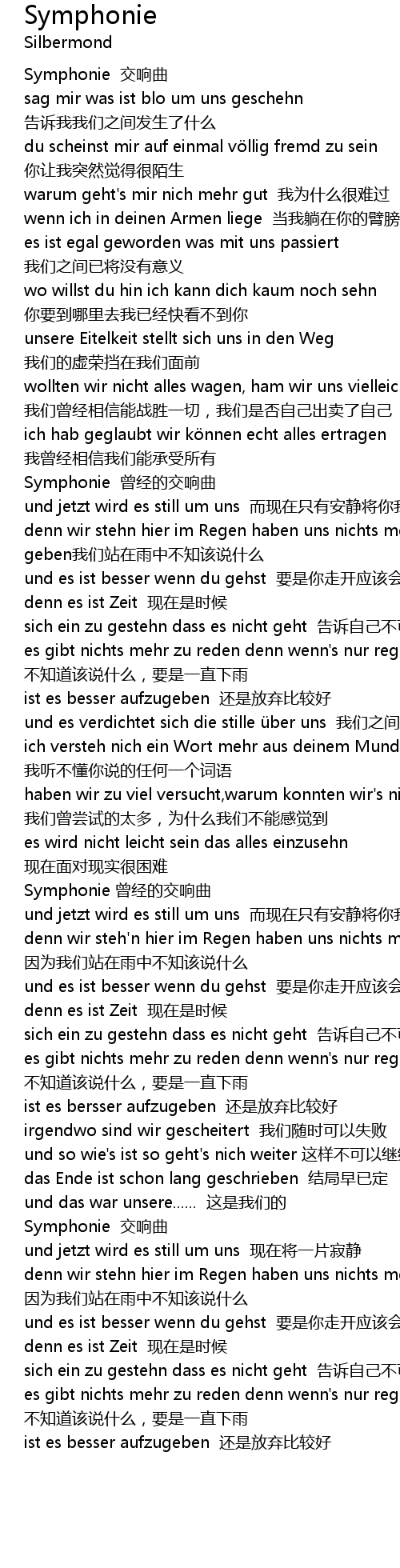 | [01:18.05] | denn wir stehn hier im Regen haben uns nichts mehr zu geben wǒ men zhàn zài yǔ zhōng bù zhī gāi shuō shí mǒ |