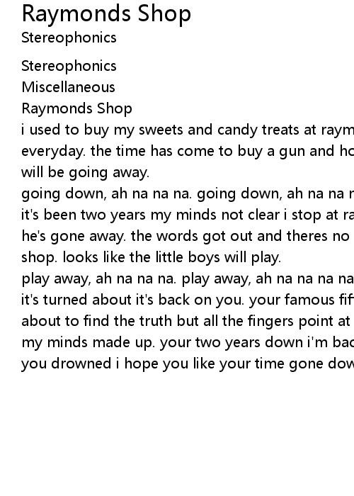 it's been two years my minds not clear i stop at raymonds shop, it's boarded up he's gone away. the words got out and theres no doubt it came from raymonds shop. looks like the little boys will play. |
