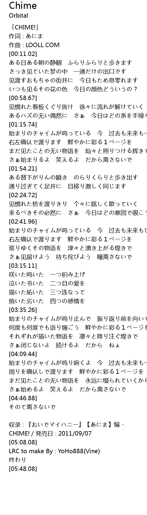 | [05:00.08] | shou lu bian CHIME! fa mai ri 2011 09 07 |