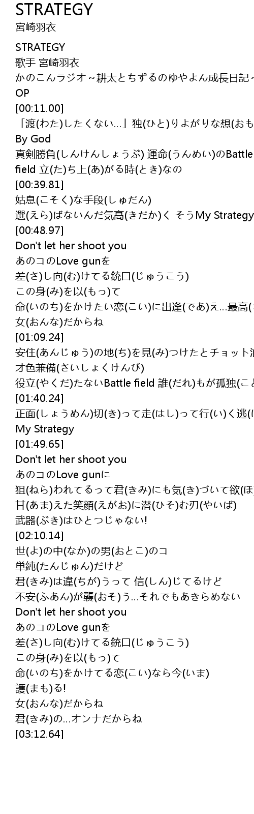 | [00:40.63] | 姑息(こそく)な手段(しゅだん) 選(えら)ばないんだ気高(きだか)く そうMy Strategy |