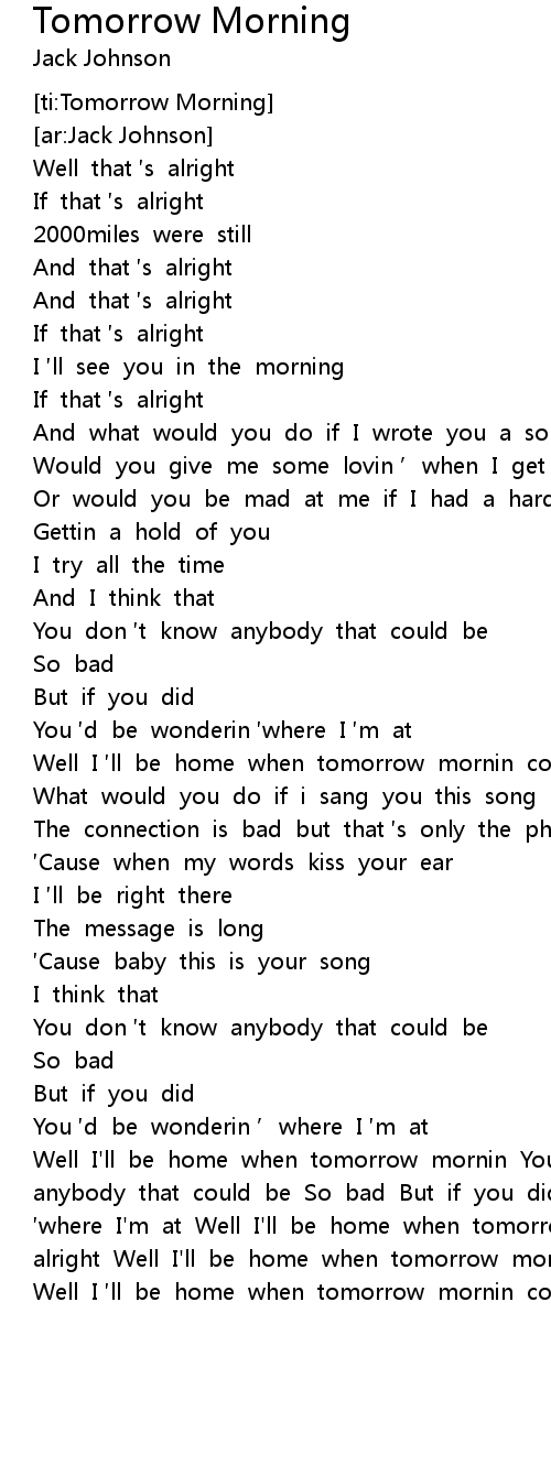 | [02:03.73] | Well I' ll be home when tomorrow mornin You don t know anybody that could be So bad But if you did You' d be wonderin where I' m at Well I' ll be home when tomorrow mornin And that s alright Well I' ll be home when tomorrow mornin And that s alright Well I ll be home when tomorrow mornin comes |