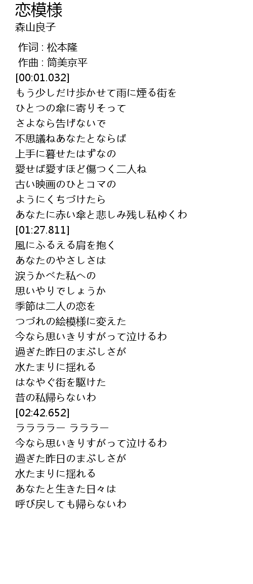 | [01:16.709] | あなたに赤い傘と悲しみ残し私ゆくわ |