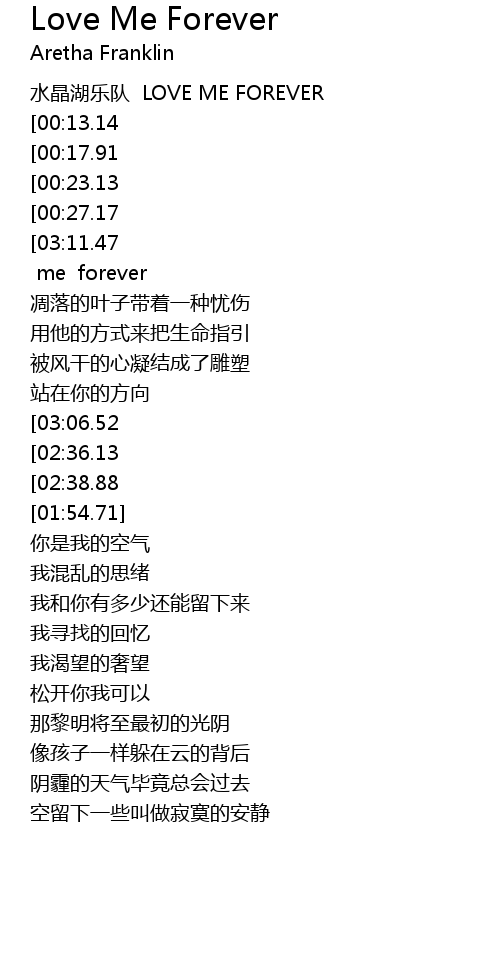 | [03:13.34][03:11.47][03:00.75][02:30.85][02:20.37][02:11.33][01:41.85][01:40.17][01:32.85][01:30.13][00:40.62][00:31.61] | Love me forever |