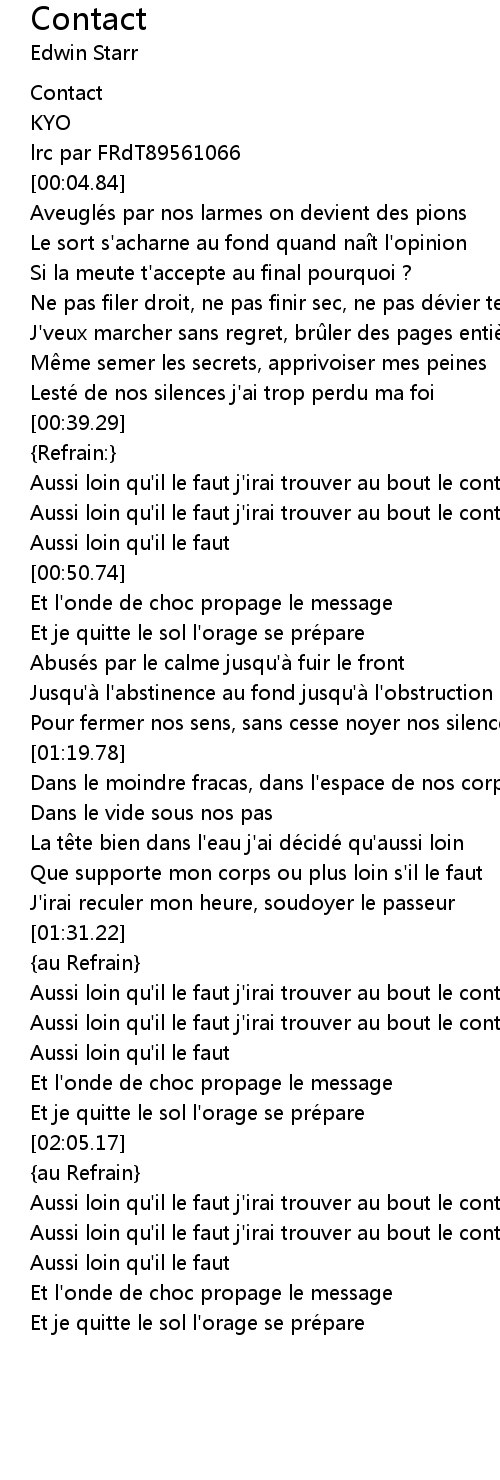 | [00:44.43] | Aussi loin qu'il le faut j'irai trouver au bout le contact |