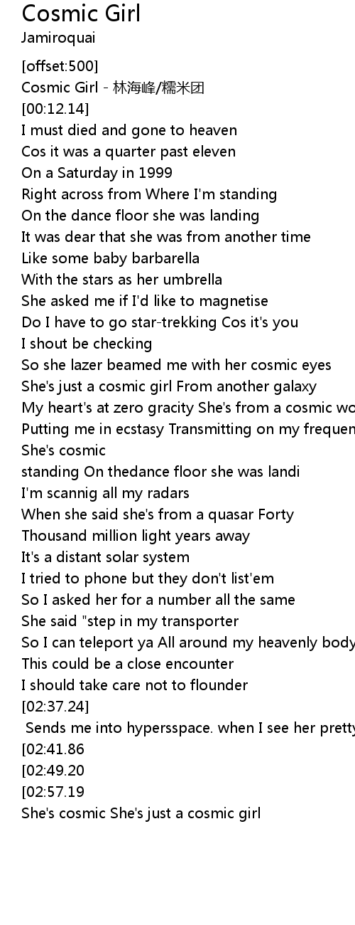 | [03:29.34][02:41.86] | She' s just a cosmic girl From another galaxy |