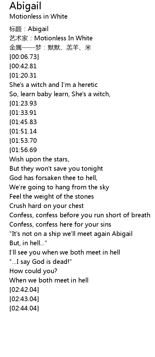 | [00:24.21][01:33.91][01:41.90] | Oh Abigail how could you do this to us? |