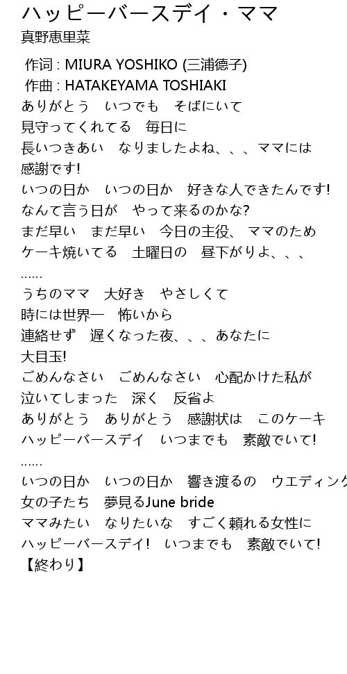 | [00:57.38] | まだ早い まだ早い 今日の主役、 ママのため |