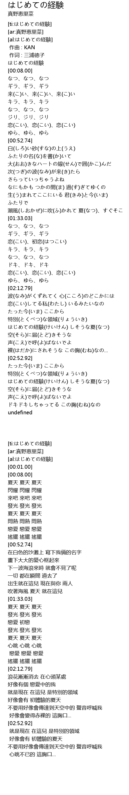| [03:13.46] | はじめての経験(けいけん) しそうな夏(なつ) |