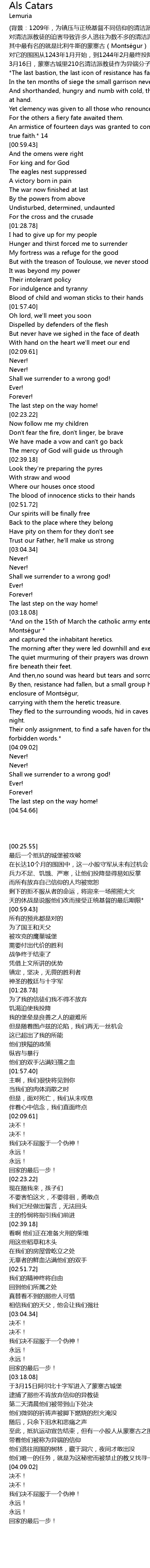 | [00:01.31] | (背景:1209年,为镇压与正统基督不同信仰的清洁派教徒,教皇发起战争,史称阿尔比十字军。 |