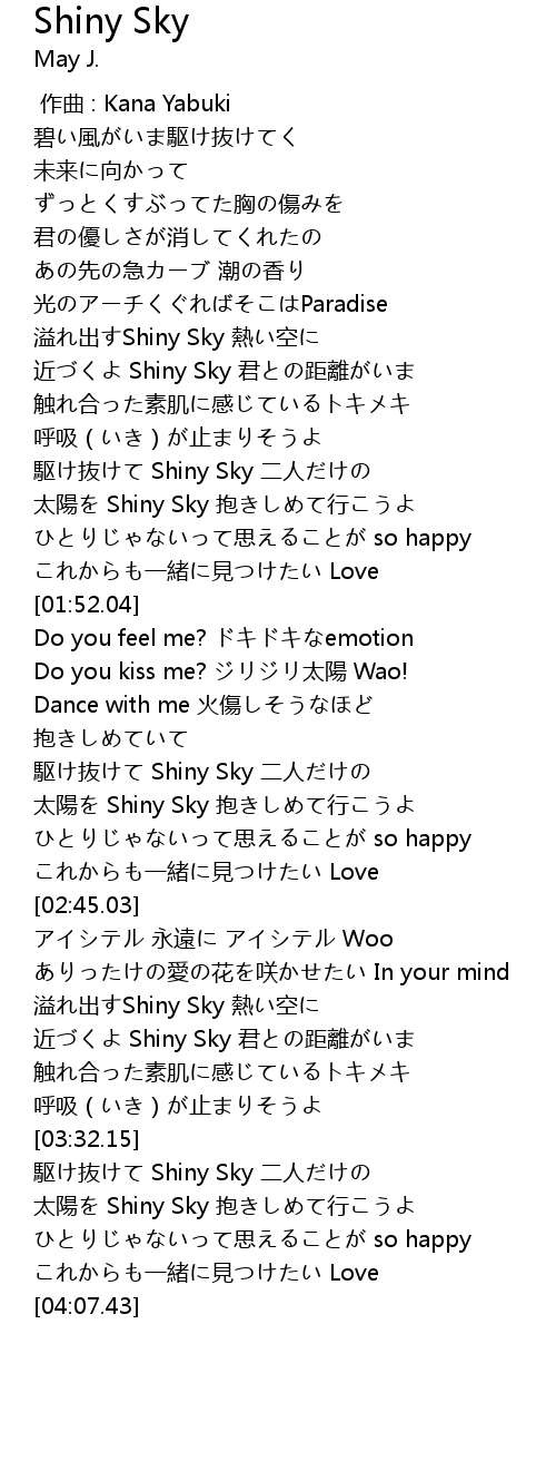 | [02:19.40] | 太陽を Shiny Sky 抱きしめて行こうよ |